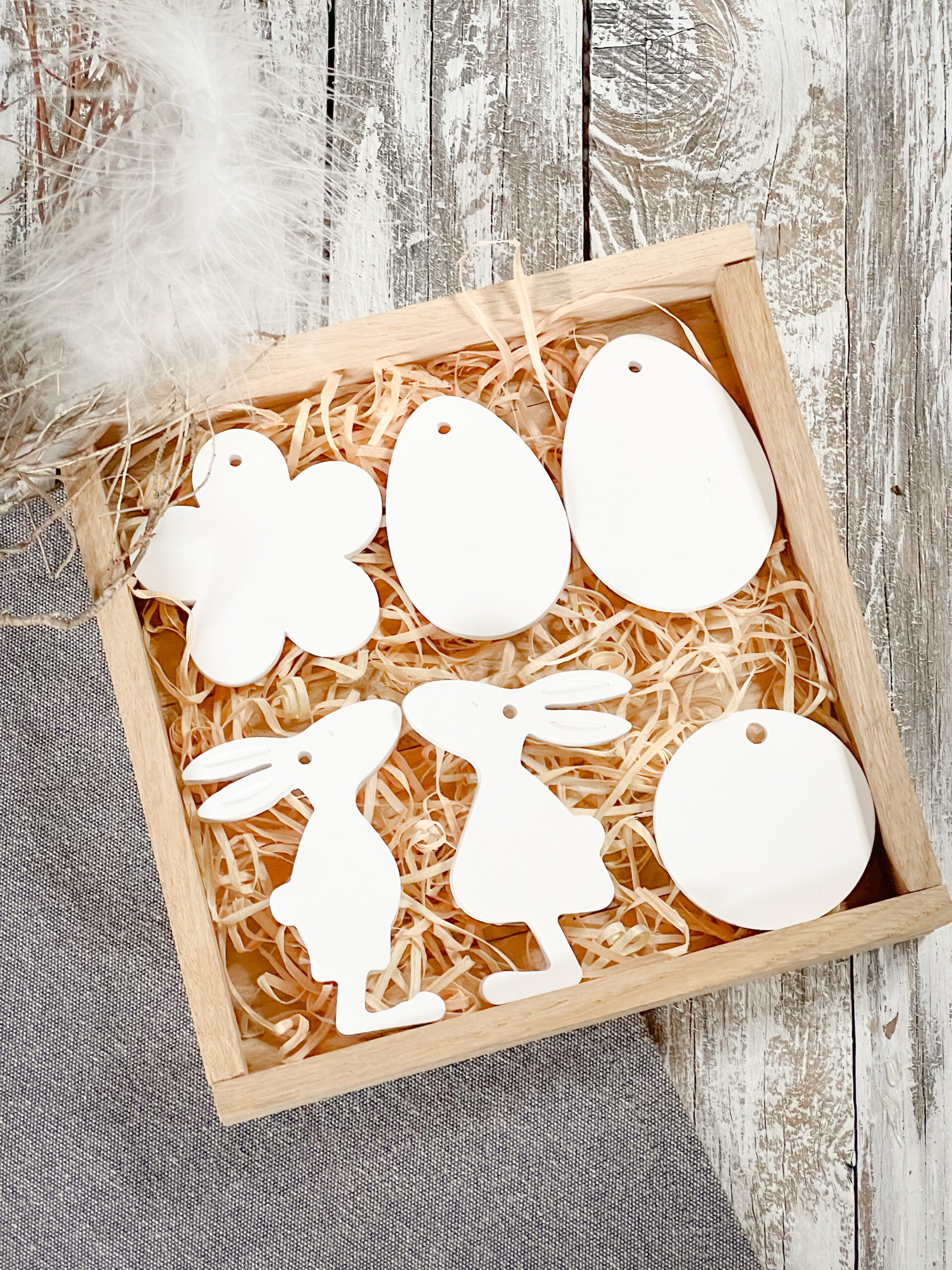 Inhalt: Set mit 6 verschiedene Anhänger gemäss Foto aus Giesspulver (auf Gibsbasis). Ohne Holztablett.